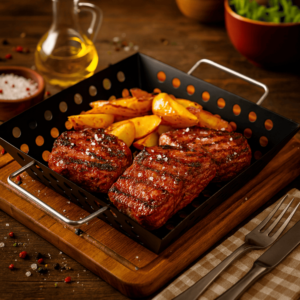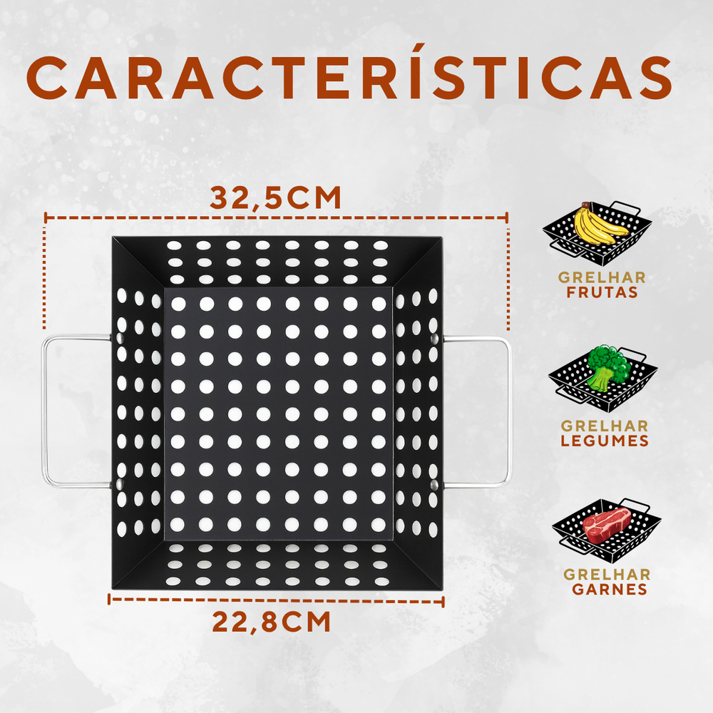 🔥 Pode ir diretamente sobre as brasas ou grelha, ideal para grelhar legumes, carnes, frutos do mar e acompanhamentos.