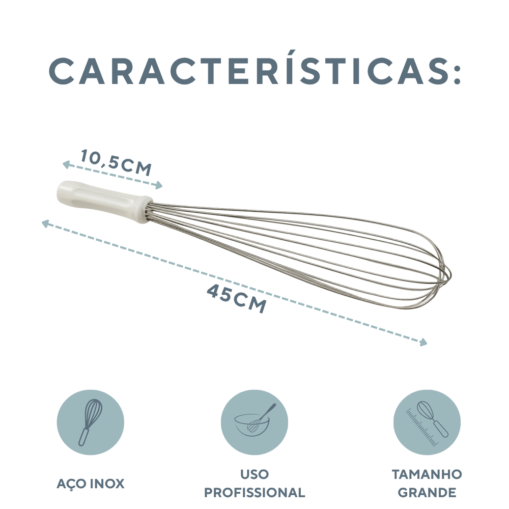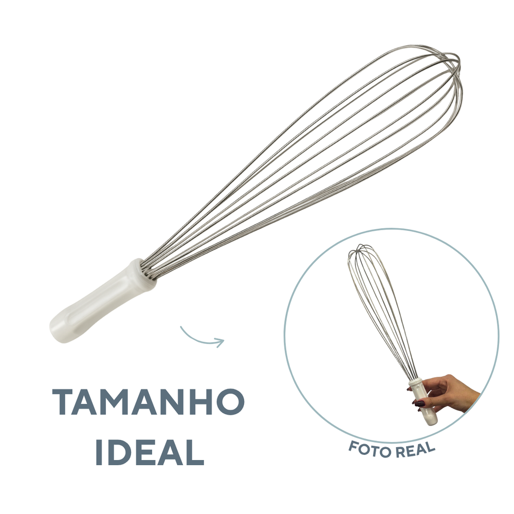 O fouet de 45cm é o aliado ideal para quem busca eficiência e praticidade na cozinha! Feito em aço inox de alta resistência, ele garante durabilidade, leveza e fácil higienização, sendo perfeito para bater massas leves, claras em neve, cremes e molhos com agilidade.