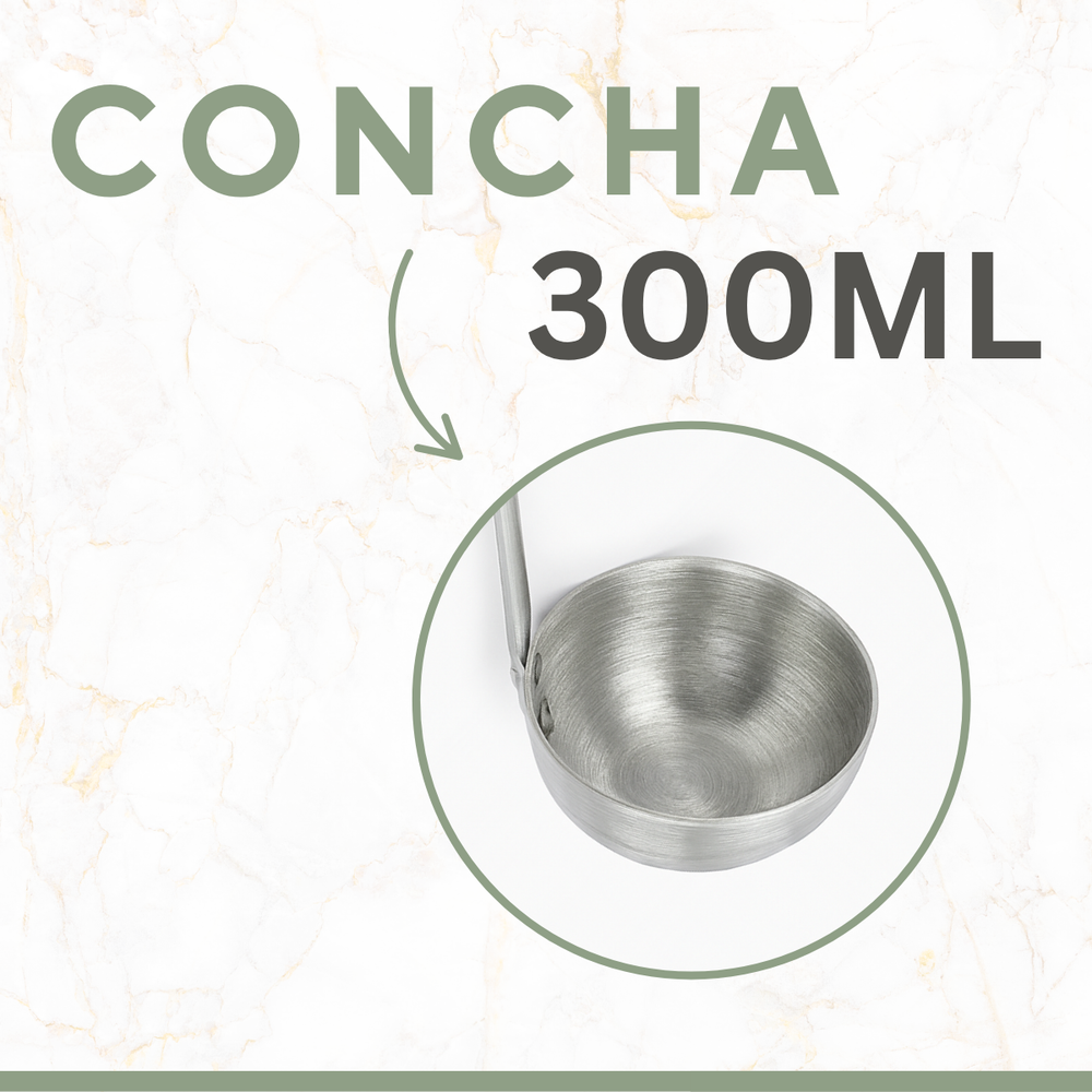 O design curvado da concha facilita a retirada de sopas, caldos, feijoadas e outros preparos diretamente de caldeirões, panelões e marmiteiros.