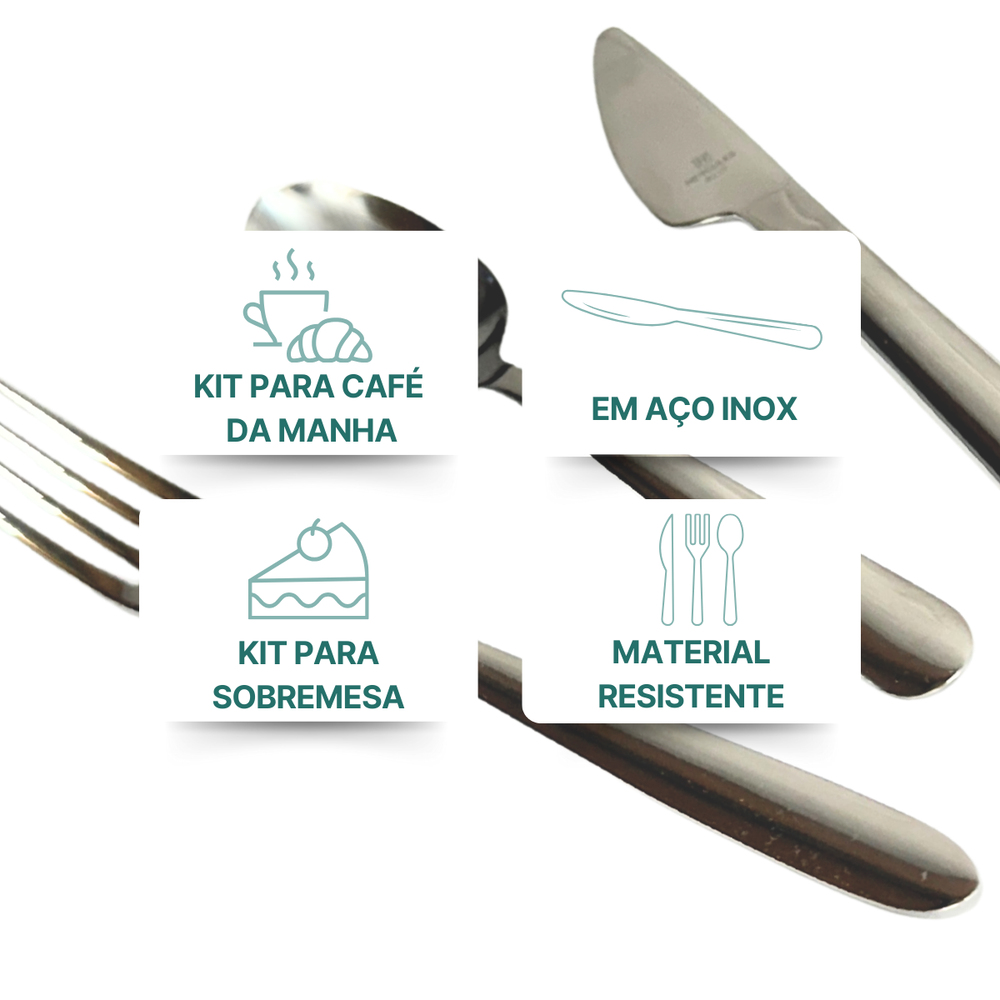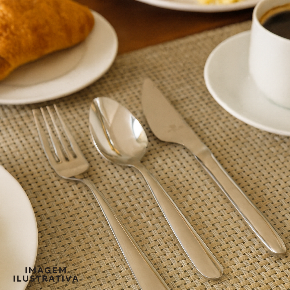 Praticidade e elegância para a primeira refeição do dia. Este kit é composto por 1 garfo, 1 faca e 1 colher de sobremesa, ideais para servir pães, bolos, frutas e outras delícias do café da manhã ou lanche da tarde. Com design funcional e acabamento refinado, é perfeito para uso diário.