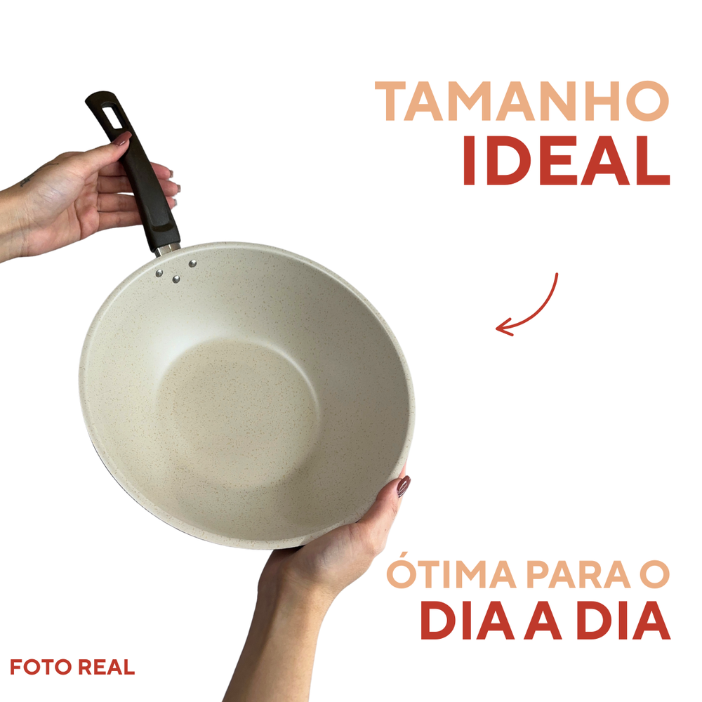Produzida em alumínio antiaderente de alta qualidade, distribui o calor de forma uniforme e evita que os alimentos grudem, garantindo mais praticidade e menos uso de óleo.