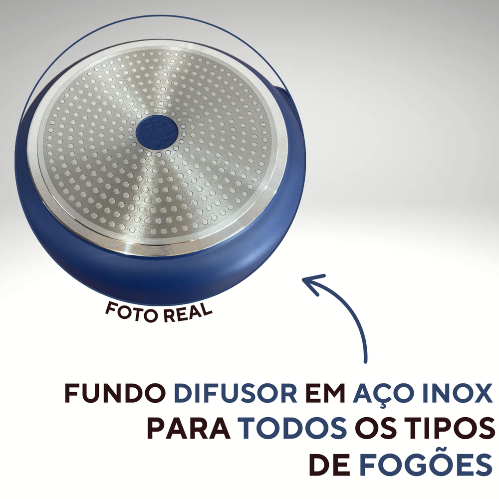 - Fundo difusor em aço inox: distribui o calor de forma uniforme, evitando pontos quentes e garantindo melhor resultado nas receitas.