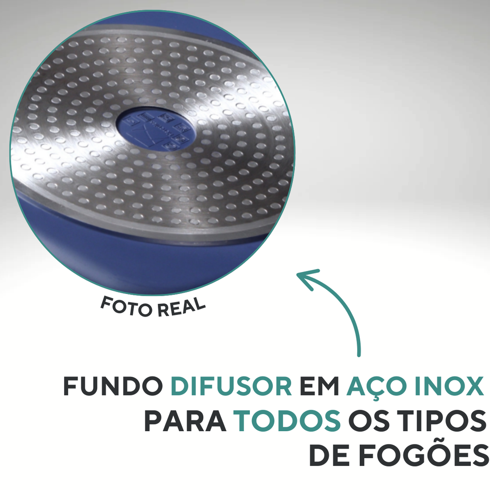 - Fundo difusor em aço inox: distribui o calor de forma uniforme, evitando pontos quentes e garantindo melhor resultado nas receitas.