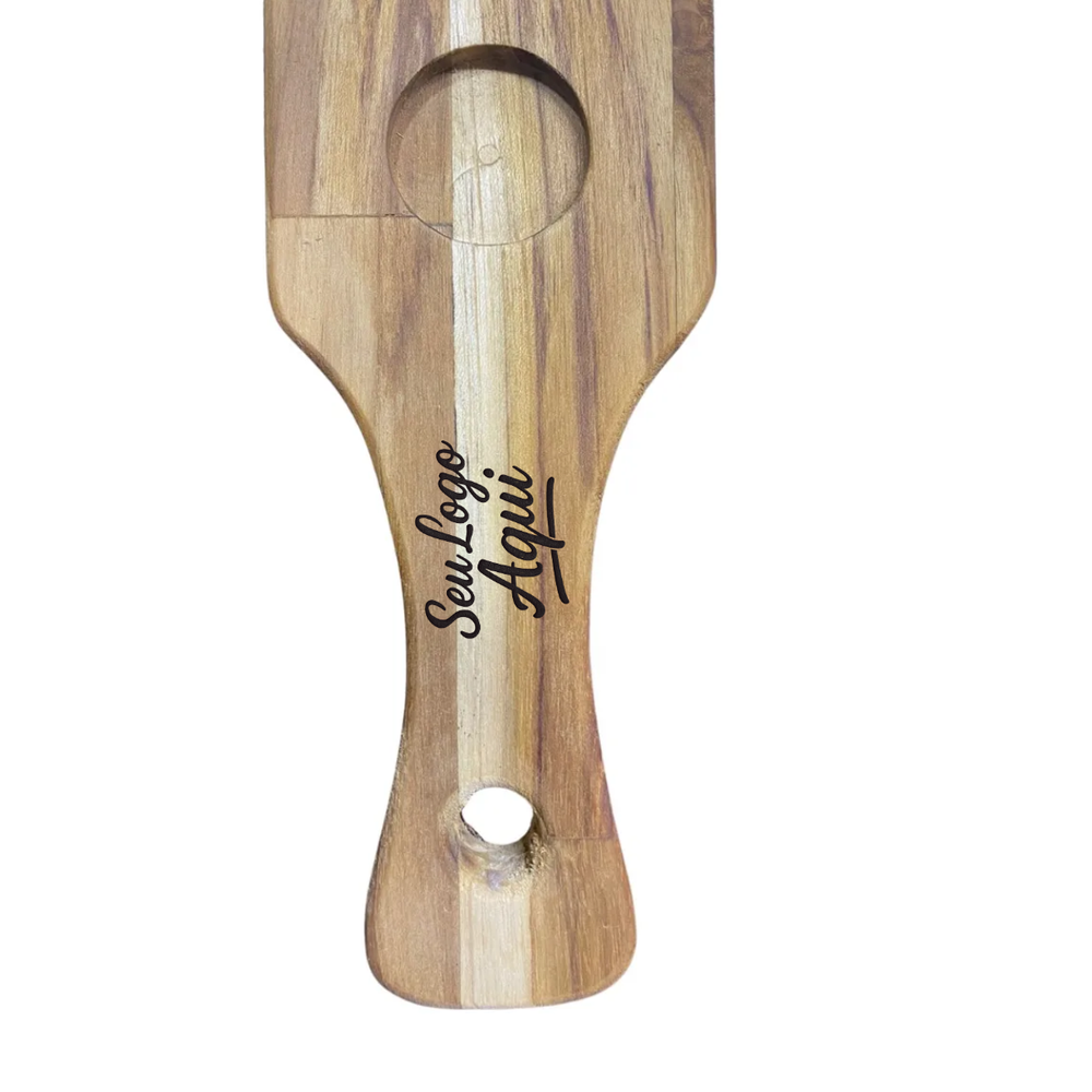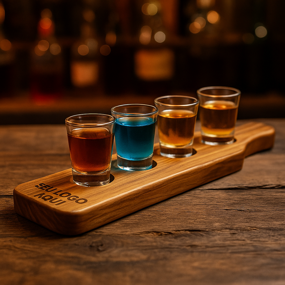 Sirva com estilo e personalidade! A Tábua Shot A Gourmet é feita em madeira teca nobre, resistente à umidade e com acabamento natural que valoriza o visual de qualquer bar, restaurante ou evento.