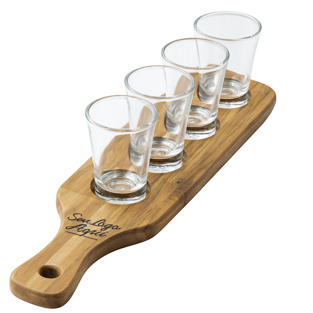 Compartimentos: 4 espaços ajustados para copos shot de base 3,5 cm