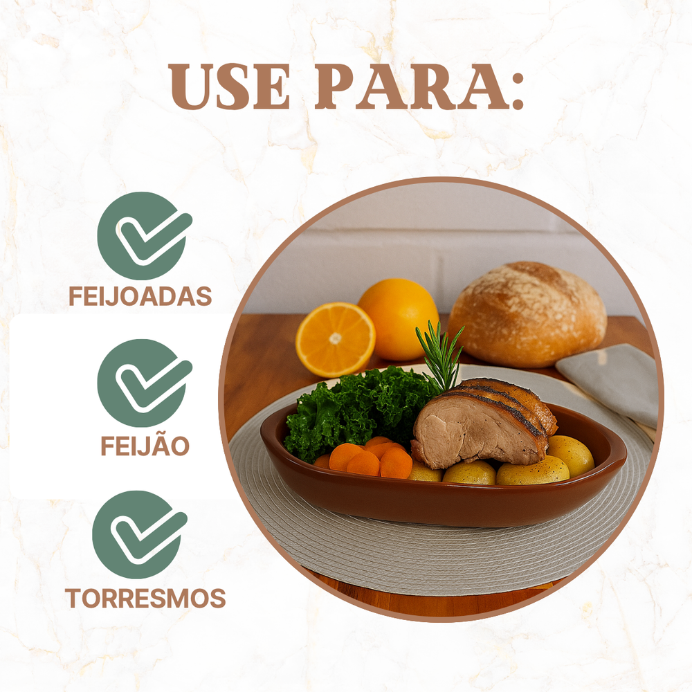 Fabricada em cerâmica refratária marrom, resiste a altas temperaturas e pode ser usada com segurança no forno tradicional e micro-ondas, permitindo preparar e servir o alimento na mesma peça.
