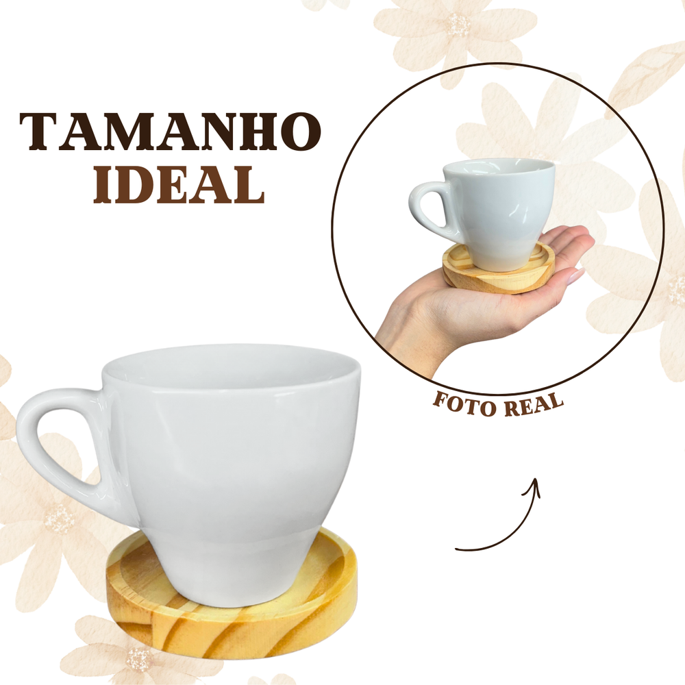 Com capacidade de 200ml, esta xícara de porcelana acompanha um pires em madeira pinus de acabamento liso e natural, formando um conjunto charmoso e funcional para servir cafés, cappuccinos, chás e outras bebidas quentes. Ideal para uso doméstico, estabelecimentos gastronômicos ou para presentear.