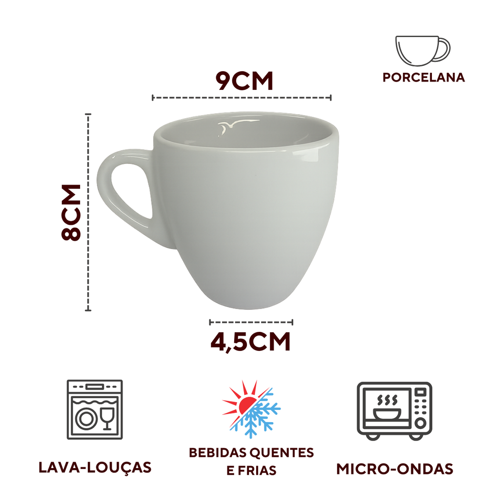 Xícara modelo Coquinho com cabo, feita em porcelana branca de 200ml, perfeita para servir chá, cappuccino, café com leite ou outras bebidas quentes. Seu design tradicional, com formato arredondado e pegada confortável, é muito utilizado em padarias, restaurantes, pousadas, hotéis e também em residências.